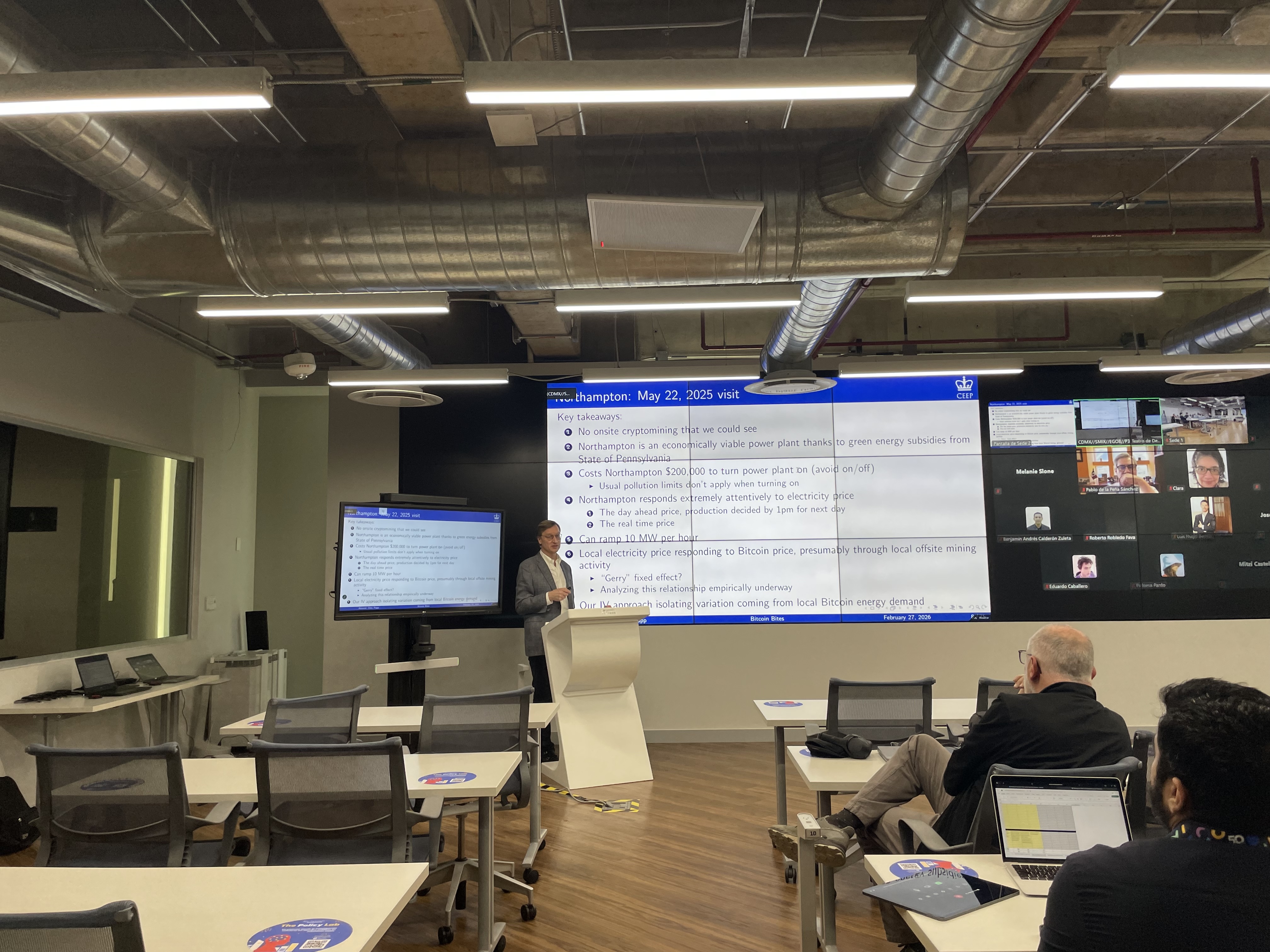Durante el evento, Doug Almond expuso los principales hallazgos del estudio, el cual examina el caso de plantas de energía a carbón en Pensilvania, entre ellas Scrubgrass y Panther Creek —operadas por la empresa Stronghold Digital Mining— así como la planta Northampton. Estas instalaciones, que anteriormente se encontraban en proceso de retiro o en condiciones de inviabilidad económica, fueron reactivadas para abastecer la creciente demanda energética asociada a la minería de Bitcoin.